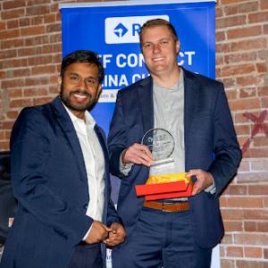 Ravi Polishetty presents a recognition award to Ryan Tubbs, Mayor of Celina, Texas, during the REF Connect Celina Chapter event, highlighting leadership and public-private collaboration.