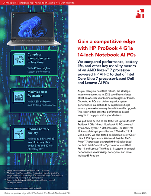 PALO ALTO, CA, UNITED STATES, October 31, 2025 /EINPresswire.com/ -- Organizations planning to refresh their PC fleet in 2026 have a difficult decision to make. Workers need fast, seamless performance to keep up. For teams that work remotely or need to travel frequently, battery life is also a key concern. Among the countless PC options available on the market, businesses are seeking systems that balance these two factors and help their staff stay productive.Principled Technologies (PT) has released a test report highlighting the advantages of one system: the HP ProBook 4 G1a 14-inch Notebook AI PC. Powered by an AMD Ryzen 7 250 processor, this system beat two competitors on several benchmarks and battery life metrics in PT testing. To offer a multifaceted picture of system performance, PT tested with Cinebench 2024, Procyon Office Productivity Benchmark, and Geekbench 6, among other benchmarks.