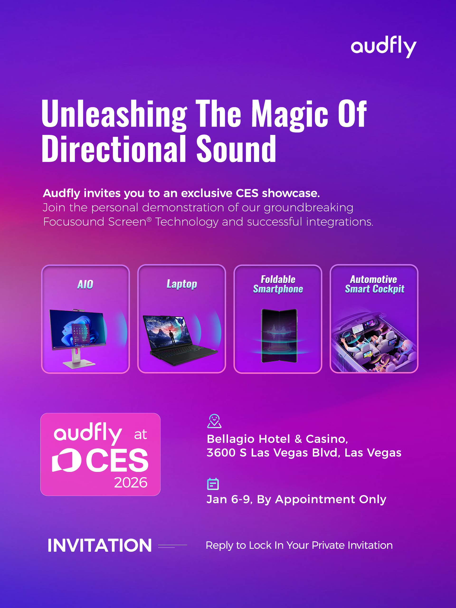 About Audfly: Audfly is a global leader in audio innovation and a pioneer in directed audio technology worldwide. Its groundbreaking Focusound Screen® technology, a transparent film-based directional sound solution, has transformed the integration of audio into consumer electronics. Expanding beyond screens, Audfly also provides versatile directional speaker modules and dual-directional voice interaction solutions tailored for digital signage, kiosks, and intelligent terminals. By creating a personal soundscape with enhanced privacy, immersion, and audio-visual enjoyment, Audfly redefines user experiences across consumer and professional markets.
