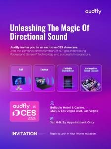 LAS VEGAS, NV, UNITED STATES, January 4, 2026 /EINPresswire.com/ -- The wait is over. Audfly, a global leader in innovative acoustic applications, officially welcomes media, partners, and tech enthusiasts to its exclusive showcase at the Bellagio Hotel & Casino. Starting today through January 9, Audfly is ushering in a new era of intelligent auditory interaction, demonstrating how directional sound is redefining the user experience for the AI generation.